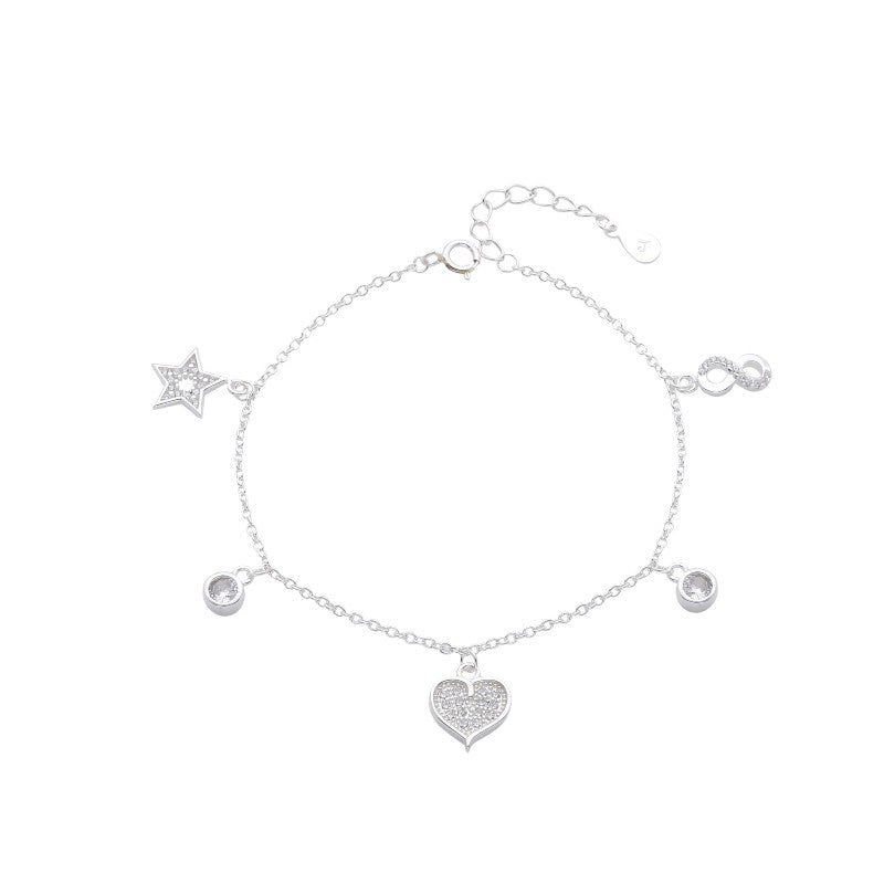 Pulsera Dijes Estrella, Corazon, Infinito y 2 Puntos de Luz 20cm - Plata 925 Importado